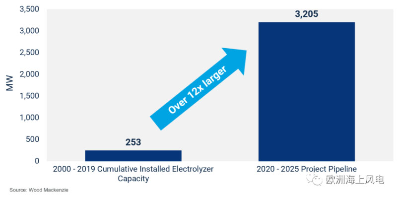 盡管”綠色氫氣“目前缺乏成本競爭力,但預(yù)測將來仍將是一個增長的市場。這也是為什么看到某國雖然退出巴黎協(xié)定,但還是要支持”綠色氫氣”的原因。整體來看,從2000年到2019年底,共部署了253兆瓦的綠色氫氣項目。但到2025年,全球范圍內(nèi)將會再部署3205 兆瓦的綠色氫氣項目,較此前增長了1272%。