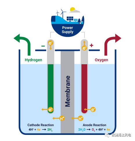 除了上面說的制氫工藝,氫氣也可以通過電解水(使用電流將水分解為氫和氧)來產(chǎn)生。任何資源生產(chǎn)的電力都能用來電解水制氫氣,如果此時使用的電能是由可再生能源(例如太陽能或風(fēng)電)產(chǎn)生的,在生產(chǎn)過程中將基本上不會產(chǎn)生溫室氣體,因此我們把這種方式生成的氫氣叫“綠色氫氣”??稍偕茉措娊庵茪溥^程示意圖如下.