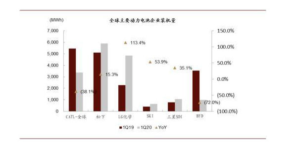 1Q20全球鋰電池測算總裝機量為19.5GWh,同降10.9%;其中中國裝機5.7GWh,同降54%,海外裝機13.8GWh,同增44%[1]。