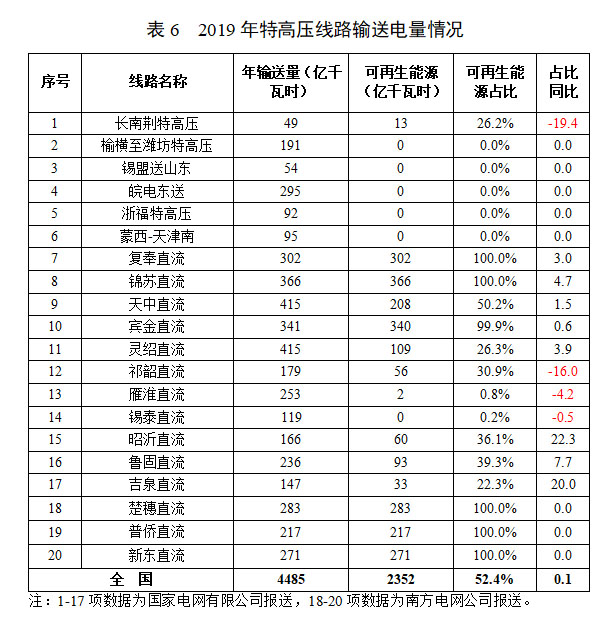2019年,20條特高壓線路年輸送電量4485億千瓦時,其中可再生能源電量2352億千瓦時,同比提高12.8%,可再生能源電量占全部輸送電量的52.4%。國家電網(wǎng)有限公司運營的17條特高壓線路輸送電量3715億千瓦時,其中可再生能源電量1581億千瓦時,占輸送電量的43%;南方電網(wǎng)公司運營的3條特高壓線路輸送電量770億千瓦時,全部為可再生能源電量。