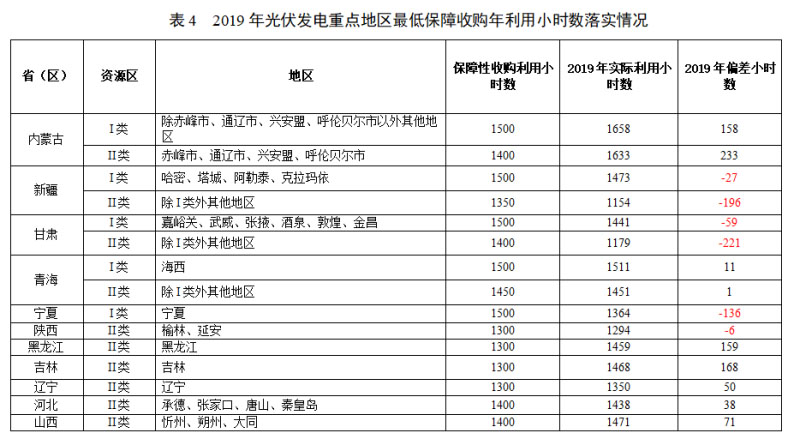 2019年,在規(guī)定光伏發(fā)電最低保障收購年利用小時數(shù)的地區(qū)中,新疆、甘肅、寧夏和陜西4?。▍^(qū))未達(dá)到光伏發(fā)電最低保障收購年利用小時數(shù)要求,其中,新疆I類和II類資源區(qū)實際利用小時數(shù)比最低保障收購年利用小時數(shù)地區(qū)分別低27小時和196小時,甘肅I類和II類資源區(qū)分別低59小時和221小時,寧夏I類資源區(qū)低136小時,陜西II類資源區(qū)低6小時。