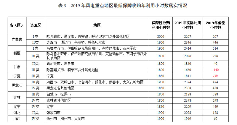 2019年,在規(guī)定風(fēng)電最低保障收購年利用小時數(shù)的地區(qū)中,甘肅III類資源區(qū)和寧夏III類資源區(qū)未達(dá)到風(fēng)電最低保障收購年利用小時數(shù)要求,實際利用小時數(shù)比最低保障收購年利用小時數(shù)分別低140小時和39小時。