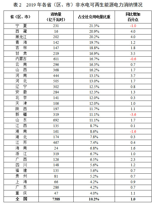 2019年,全國非水電可再生能源電力消納量為7388億千瓦時,占全社會用電量比重為10.2%,同比提高1個百分點。2019年各省(區(qū)、市)非水電可再生能源電力消納情況如表2。