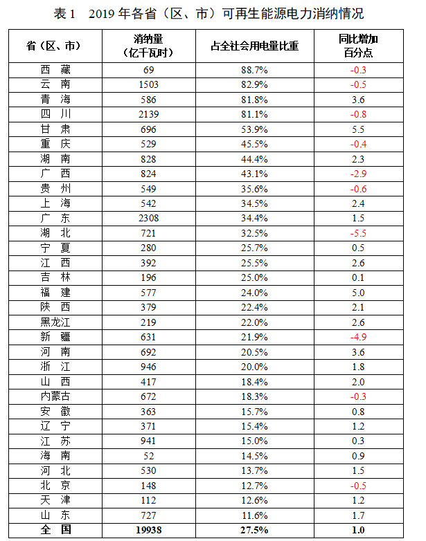 2019年,包含水電在內(nèi)的全部可再生能源電力實際消納量為19938億千瓦時,占全社會用電量比重為27.5%,同比提高1個百分點。2019年各?。▍^(qū)、市)可再生能源電力消納情況如表1。