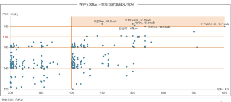 數據顯示,國內在產的純電動車型(300km+車型續(xù)航)中,普遍的動力電池系統(tǒng)能量密度為140-160Wh/kg,少數車型達到170Wh/kg,極少數車型可達到180Wh/kg(其配套電量均>60kWh);而搭配孚能科技動力電池的北汽EU5升級版(電池系統(tǒng)能量密度高達180.05Wh/kg)則成為當下登上能量密度“珠峰”的極少數車型之一。