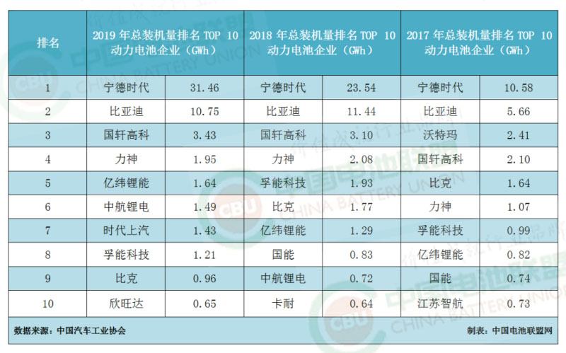 相比2018年,去年我國新能源汽車配套動力電池企業(yè)減少了13家,動力電池行業(yè)洗牌進一步加劇。對比2018年,北京國能、卡耐新能源跌出前10榜單,其他8家企業(yè)則仍然穩(wěn)定在前10行列,時代上汽、欣旺達躋身進前10行列,頭部競爭格局相對較穩(wěn)定。