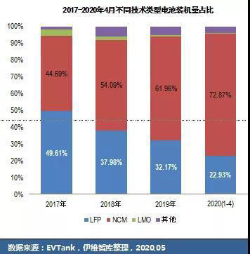 目前,三元鋰電池一騎絕塵,研究機(jī)構(gòu)EVTank最新的數(shù)據(jù)顯示,今年1~4月,國(guó)內(nèi)三元鋰電池(NCM,正極材料為鎳鈷錳三種材料)裝機(jī)量占比升至72.87%,而磷酸鐵鋰電池(LFP)的裝機(jī)量進(jìn)一步跌至22.93%,錳酸鋰電池(LMO)以及其他電池加起來占的比例不足5%。這與前幾年的動(dòng)力電池格局明顯不同,就在2017年,磷酸鐵鋰電池與三元鋰電池的裝機(jī)量占比分別是49.61%和44.69%,但次年前者就被后者趕超,且差距逐年拉大。