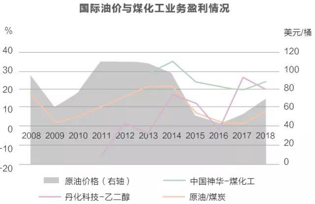 聯(lián)合信用評(píng)級(jí)有限公司在研究報(bào)告中以中國(guó)神華煤化工(煤制烯烴為主)和丹化科技煤化工(煤制乙二醇為主)為例,指出兩者煤化工業(yè)務(wù)毛利率在2014—2016年國(guó)際原油價(jià)格下跌,“原油/煤炭”下降的背景下,盈利能力下降。其中“原油/煤炭”這一比值作為參照系,當(dāng)該比值上升時(shí),表明煤價(jià)相對(duì)于油價(jià)升高,石油化工或更具成本優(yōu)勢(shì),反之則現(xiàn)代煤化工更具優(yōu)勢(shì)。