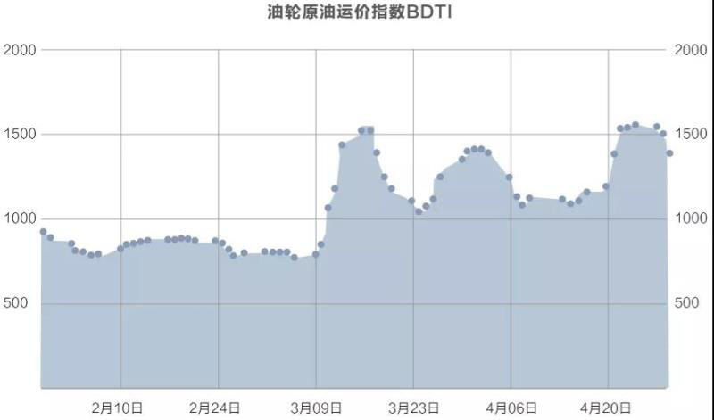 同時(shí),暴跌的油價(jià)使部分國(guó)家和地區(qū)獲得了低價(jià)囤油的契機(jī),進(jìn)而刺激了國(guó)際原油運(yùn)輸業(yè)的火爆。自3月6日OPEC+掀起價(jià)格戰(zhàn)后,原油運(yùn)輸指數(shù)(BDTI指數(shù))便連續(xù)上漲,并一直處于高位。截至4月29日原油運(yùn)輸指數(shù)達(dá)到1387,并曾觸及1550的高位,相比油價(jià)暴跌前的764近乎翻番。
