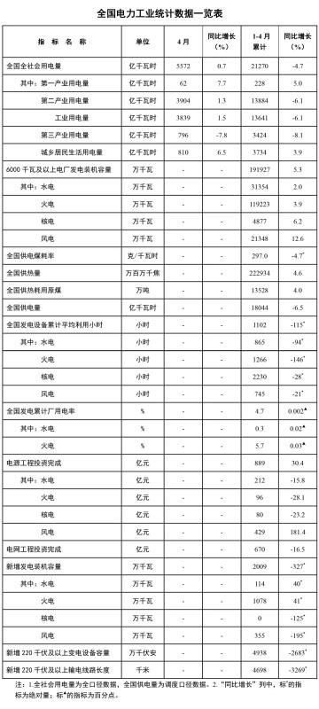 5月18日,國家能源局發(fā)布1-4月份全國電力工業(yè)統(tǒng)計數(shù)據(jù)。