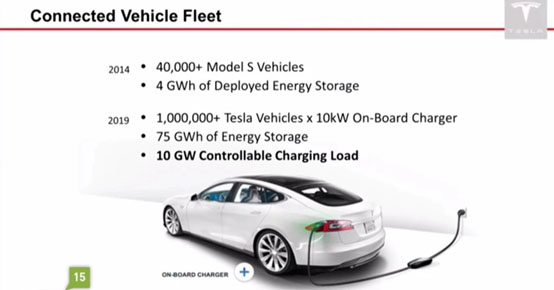 Straubel的演講PPT顯示,2019年,特斯拉總保有量會(huì)突破100萬(wàn)輛,將會(huì)有超過(guò)10GW的可控充電負(fù)載,75GWh的電能存儲(chǔ)能力。實(shí)際情況是,特斯拉在2020年3月生產(chǎn)出了第100萬(wàn)輛電動(dòng)汽車。