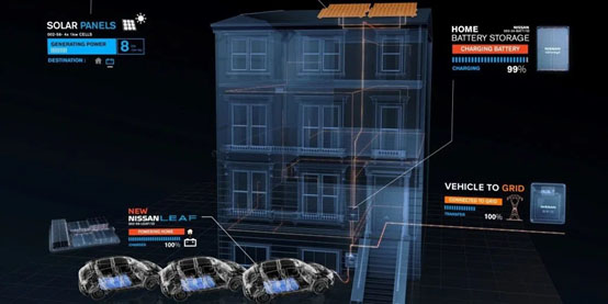 圖:尼桑汽車公司公布的電動(dòng)汽車反向充電示意圖,與戶用光伏、家庭儲(chǔ)能配合,充分與電網(wǎng)連接,提高使用效率