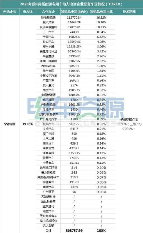 第二部分:2020年1-4月專用車動(dòng)力電池裝機(jī)量