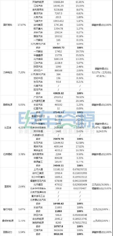 此外,使用三元鋰的主要車企有華晨鑫源、長安汽車、上汽大通,其裝機(jī)量分別是15.8MWh,11.69MWh和11.61MWh。