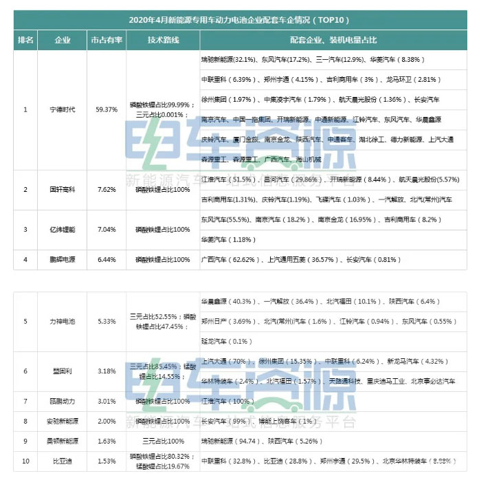 從專用車動(dòng)力電池企業(yè)的配套情況來看,4月,寧德時(shí)代配套31家車企,在專用車的市場占有率高達(dá)59.37%,幾乎所有配套的車型均采用磷酸鐵鋰電池。