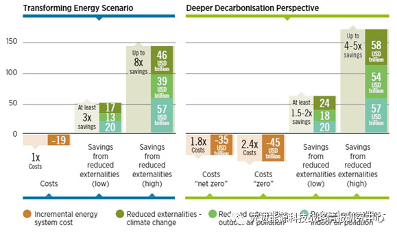 2、加快可再生能源部署和提高能效回報將遠大于投入。按照“轉型能源情景”,能源轉型每花費1美元,將獲得3-8美元的投資回報(圖5)。換言之,到2050年“轉型能源情景”將增加19萬億美元的成本,但通過降低環(huán)境和健康損害,將獲得50-142萬億美元的回報。要實現(xiàn)凈零排放,“更深度脫碳情景”將需再增加16萬億美元投入,如果實現(xiàn)完全無排放則將增加26萬億美元成本,但零碳排放帶來的收益將達到62-169萬億美元。另一種衡量成本的方法是在此期間減少一噸碳排放的成本。對于“轉型能源情景”,該成本為34美元/噸,對于“更深度脫碳情景”凈零排放,成本為100美元/噸,對于“更深度脫碳情景”完全零排放,成本為156美元/噸。