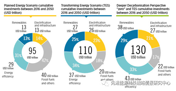 1、為了確保氣候安全,需要擴大對清潔能源技術的投資并轉變投資方向。需要將化石燃料投資轉向可再生能源和能效,逐步取消化石燃料補貼。到2050年,“轉型能源情景”中能源系統(tǒng)總投資需要達到110萬億美元,約占同期年均GDP的2%。其中,超過80%的資金應投資可再生能源、能效、終端用能電氣化以及電網(wǎng)和靈活性。如果以年度計算,每年的投資水平應達到約3.2萬億美元。相比之下,2014-2018年期間平均每年的投資約為1.8萬億美元,而在“已規(guī)劃能源情景”下未來將達到2.9萬億美元/年。如果希望實現(xiàn)“零碳排放”,到2050年對能源系統(tǒng)總投資需要達到130萬億美元(見圖4)。