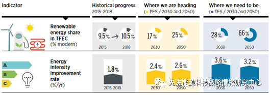 4、作為降低碳排放的主要解決方案,能效和可再生能源需加速部署。能效和可再生能源是實現(xiàn)全球能源轉型的兩個關鍵解決方案。然而,由于能源需求持續(xù)增長,2010年以來可再生能源在全球終端能源消費中所占的份額僅在10%左右緩慢增長。2019年能源強度僅增長1.2%,低于過去十年的平均水平(1.8%)。按照“轉型能源情景”,可再生能源、能效和電氣化將共同貢獻90%的能源相關減排量,可再生能源在終端能源消費占比到2030年應增至28%,到2050年需達到66%,而能源強度改善速度需提高到每年3.2%,才能滿足全球氣候目標(圖3)。