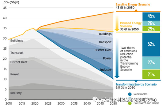 2、世界迫切需要清潔、可持續(xù)的能源解決方案以加速碳減排步伐。近年來能源發(fā)展趨勢表明了加速碳減排的必要性。盡管近年來可再生能源在能源結構中的份額、能源強度以及終端用能電氣化程度都有所改善,但發(fā)展速度難以滿足全球氣候目標需求。根據(jù)當前各國制定的政策承諾及目標(即IRENA的參考情景“已規(guī)劃能源情景”),到2050年全球一次能源需求將從目前的600 EJ增長至710 EJ,化石燃料消費量仍與當前持平,因此將無法滿足全球碳減排目標。IRENA的“轉型能源情景”和“更深度脫碳情景”提供了全球經(jīng)濟長期穩(wěn)定以及低碳安全發(fā)展的基礎。根據(jù)“轉型能源情景”,到2050年全球化石能源消費將下降75%,能源相關碳排放將以年均3.8%的速度下降至約100億噸,比當前水平降低70%,使全球平均氣溫上升2℃以內(圖1);而“更深度脫碳情景”則有望到2050年實現(xiàn)凈零排放(最遲到2060年前實現(xiàn)),并使全球溫升控制在1.5℃以內。