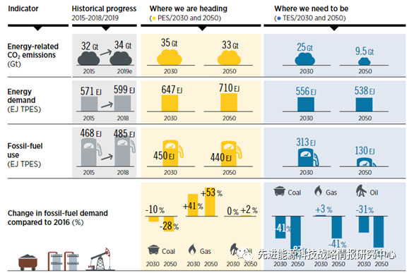 備注:TPES為一次能源供應總量;PES為“已規(guī)劃能源情景”;TES為“轉型能源情景”;Gt為十億噸;EJ為艾焦