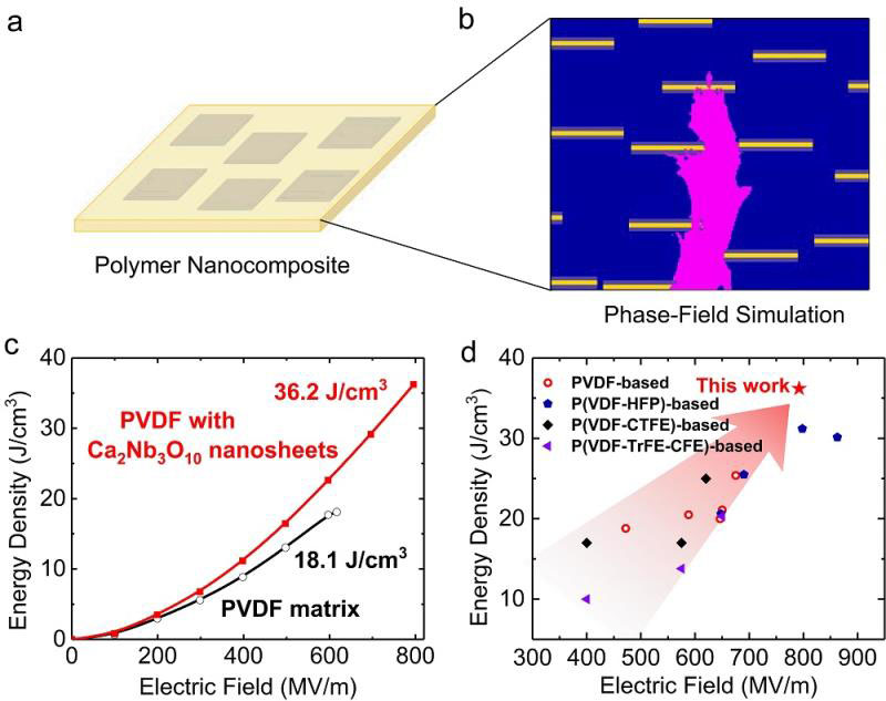 圖例說明:a. 復(fù)合材料示意圖。b. 復(fù)合材料電擊穿過程的相場模擬中,帶負電Ca2Nb3O10納米片對電樹枝發(fā)展起阻礙作用。c. PVDF基復(fù)合材料與純PVDF的儲能密度與電場的關(guān)系。d. 不同聚合物基納米復(fù)合材料的擊穿強度和能量密度的對比。
