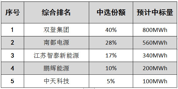 根據(jù)招標(biāo),本次采購(gòu)周期為1年,采購(gòu)規(guī)模的預(yù)估量為2.0GWh。招標(biāo)產(chǎn)品型號(hào)分為20Ah、50Ah、100Ah、150Ah、200Ah五大類。項(xiàng)目不劃分標(biāo)段,采用份額招標(biāo),中標(biāo)人數(shù)量為5家。具體中標(biāo)份額分配如下: