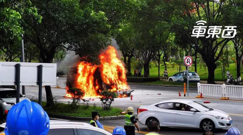 起火應該是車頭追尾校車所致,但從視頻看,起火部位在車輛底部,極有可能是動力電池熱失控后發(fā)生大火。從現(xiàn)場的畫面來看,在交警采用了干粉滅火器進行滅火后,火勢絲毫沒有減弱。