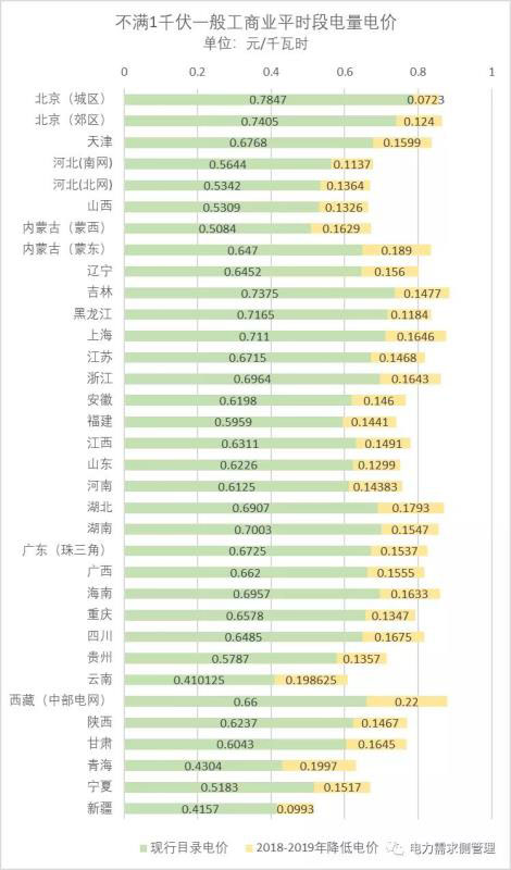 通過2018-2019連續(xù)兩年開展降電價工作,全國一般工商業(yè)目錄電價下降明顯,兩年累計共有21個省(區(qū)、市)的一般工商業(yè)目錄電價降幅達到19%。其中,2019年共19個?。▍^(qū)、市)目錄電價降幅達到10%。根據(jù)第三方評估工作組抽樣調(diào)查結(jié)果顯示,2019年全國直供電用戶度電均價降幅達10.41%,近九成轉(zhuǎn)供電終端用戶度電均價有所降低,近七成轉(zhuǎn)供電終端用戶度電均價降幅超過10%。全國各地區(qū)工商業(yè)目錄電價情況如圖1-圖4所示。