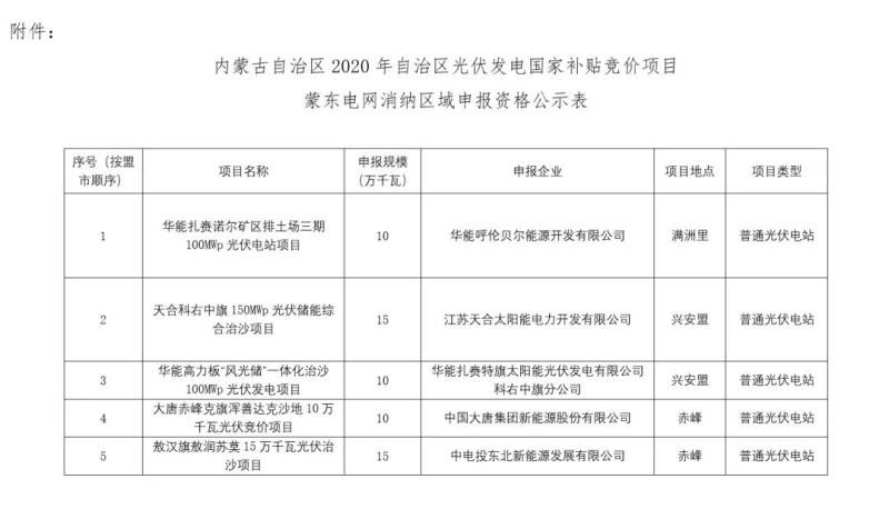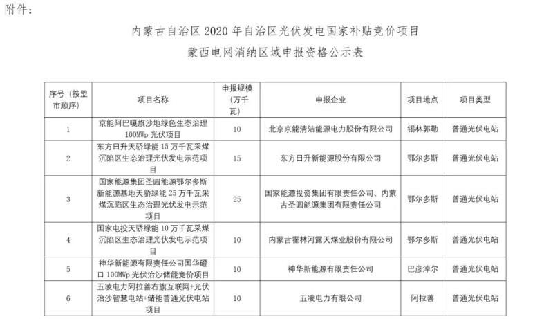 內(nèi)蒙古自治區(qū)能源局關(guān)于2020年光伏發(fā)電國(guó)家補(bǔ)貼競(jìng)價(jià)項(xiàng)目申報(bào)資格的公示
