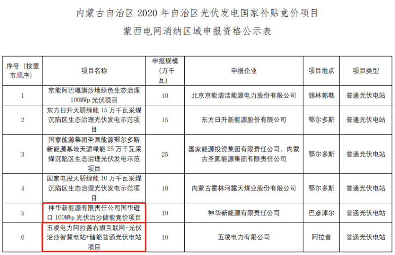 內(nèi)蒙古自治區(qū)能源局關(guān)于2020年光伏發(fā)電國家補貼競價項目申報資格的公示