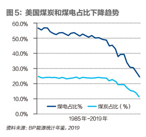 與美國煤炭和煤電占比不斷下降成為顯著對照,2005年以后,美國的天然氣和可再生能源消費占比不斷提高。2019年美國煤炭地位發(fā)了歷史性的性的變化,降至11.3%,而可再生能源占比提高到11.4%。