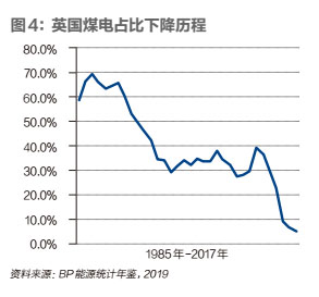 與減煤經(jīng)歷不同,英國的煤電減少走過先升后降的過程。上世紀50年代,英國為了治理散煤污染,煤炭涌向了燃煤發(fā)電,煤電在全部發(fā)電量的比重80年代末仍高達70%左右。1992年《聯(lián)合國氣候變化框架公約》簽署之后,要求發(fā)達國家率先減排二氧化碳等溫室氣體,煤電開啟了快速下降通道,到1999年,煤電占比從1989年的70%左右下降到30%。此后英國的煤電一直在30%上下,直到 2010年卡梅倫出任首相,大力推動以非化石能源發(fā)電取代煤電,乃至天然氣發(fā)電。到2018年,英國煤電占比已經(jīng)從2011年的30%,下降到5%(詳見圖4)。