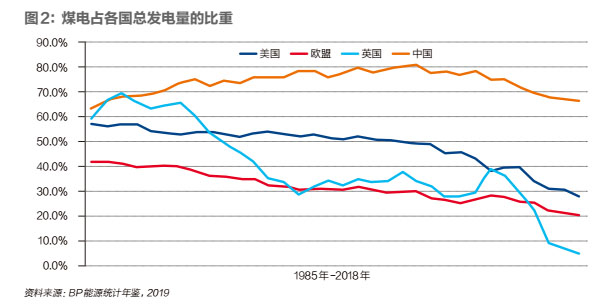 煤電而言,全球2018年煤電總發(fā)電量約10萬億千瓦時,占全部發(fā)電量的比重為38%,其中中國煤炭發(fā)電量約為4.7萬億千瓦時,占全球煤炭發(fā)電量的47%,不含中國全球煤炭發(fā)電量5.3萬億千瓦時,煤電比重只有27%。號稱挺煤的美國,煤電的比重也從2005年50%以上,降低到2019年的25%,減少了25個百分點。比特朗普上臺前的2015年也減少5個百分點。歐盟煤電占比也從2005年的30%,降低到2019年的20%。英國從2009年宣布發(fā)展低碳經(jīng)濟,逐步淘汰煤電,煤電占比已經(jīng)從2011年的30%左右,降低到2018年5%,2019年幾乎清零(詳見圖2)。