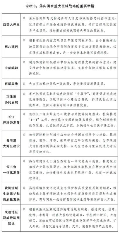 一是落實(shí)落細(xì)重大區(qū)域發(fā)展戰(zhàn)略。落實(shí)區(qū)域協(xié)調(diào)發(fā)展新機(jī)制,持續(xù)推進(jìn)西部大開發(fā)形成新格局,支持東北地區(qū)全面振興全方位振興,健全中部地區(qū)崛起政策體系和工作機(jī)制,繼續(xù)推動(dòng)?xùn)|部地區(qū)率先發(fā)展??v深推進(jìn)京津冀協(xié)同發(fā)展,加快實(shí)施雄安新區(qū)重點(diǎn)建設(shè)項(xiàng)目,完善北京非首都功能疏解政策體系。大力推進(jìn)長江經(jīng)濟(jì)帶生態(tài)環(huán)境突出問題整改和系統(tǒng)性保護(hù)修復(fù),加快構(gòu)建綜合交通運(yùn)輸體系,促進(jìn)內(nèi)河船舶改造。推動(dòng)粵港澳大灣區(qū)基礎(chǔ)設(shè)施互聯(lián)互通,有序開展國際科技創(chuàng)新中心建設(shè),加快橫琴、河套等重大合作平臺建設(shè)。高標(biāo)準(zhǔn)建設(shè)長三角生態(tài)綠色一體化示范區(qū),推動(dòng)長三角交通一體化更高質(zhì)量發(fā)展,建設(shè)虹橋國際開放樞紐。抓緊做好黃河流域生態(tài)保護(hù)和高質(zhì)量發(fā)展規(guī)劃綱要編制和出臺實(shí)施工作。大力支持成渝地區(qū)雙城經(jīng)濟(jì)圈建設(shè),打造全國高質(zhì)量發(fā)展的重要增長極。積極推進(jìn)西部陸海新通道建設(shè)。深化對口支援。支持少數(shù)民族和民族地區(qū)加快發(fā)展。推動(dòng)國家級新區(qū)、開發(fā)區(qū)等功能平臺創(chuàng)新提升發(fā)展,加快推進(jìn)資源型地區(qū)經(jīng)濟(jì)轉(zhuǎn)型和老工業(yè)城市更新改造。推動(dòng)山西開展能源革命綜合改革試點(diǎn)。繼續(xù)推進(jìn)承接產(chǎn)業(yè)轉(zhuǎn)移示范區(qū)建設(shè),在具備條件的內(nèi)陸城市打造一批高端制造業(yè)基地。制定發(fā)展海洋經(jīng)濟(jì)加快建設(shè)海洋強(qiáng)國的意見。完善主體功能區(qū)戰(zhàn)略和制度,編制《全國國土空間規(guī)劃綱要(2021-2035)》。