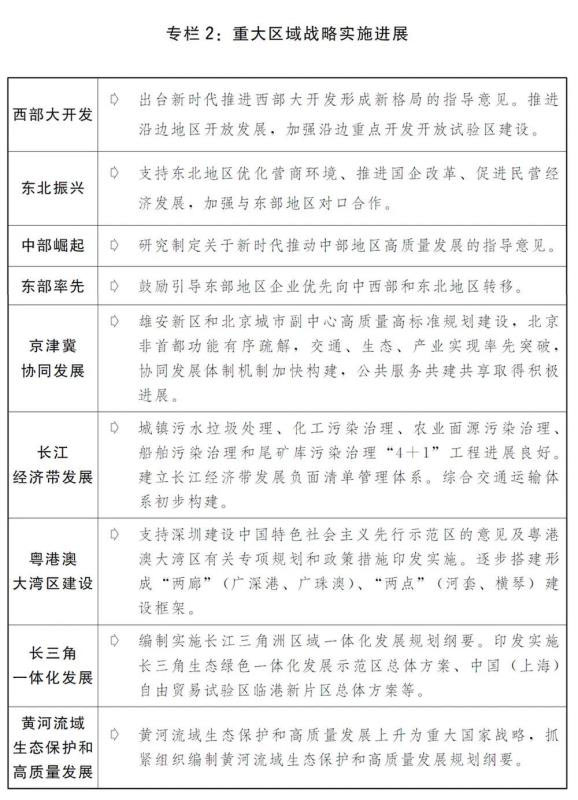 三是區(qū)域協(xié)調(diào)發(fā)展新機(jī)制加快構(gòu)建。支持西部大開發(fā)、東北振興、中部崛起、東部率先的政策體系更加完善。京津冀協(xié)同發(fā)展有力有序推進(jìn),雄安新區(qū)轉(zhuǎn)入施工建設(shè)階段。長江經(jīng)濟(jì)帶生態(tài)環(huán)境突出問題整改和生態(tài)環(huán)境污染治理成效顯著?;浉郯拇鬄硡^(qū)建設(shè)規(guī)劃政策體系進(jìn)一步完善。長三角區(qū)域一體化發(fā)展規(guī)劃綱要印發(fā)實(shí)施,生態(tài)綠色一體化發(fā)展示范區(qū)啟動(dòng)建設(shè)。黃河流域生態(tài)保護(hù)和高質(zhì)量發(fā)展規(guī)劃綱要啟動(dòng)編制。老少邊貧等特殊類型地區(qū)加快振興發(fā)展,對口支援有力推進(jìn)。海洋經(jīng)濟(jì)發(fā)展示范區(qū)建設(shè)全面啟動(dòng)。