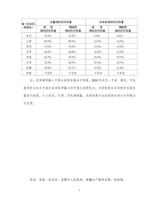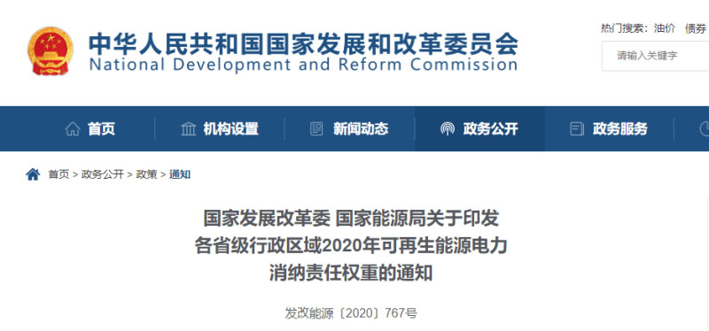 國家發(fā)展改革委 國家能源局關(guān)于印發(fā)各省級(jí)行政區(qū)域2020年可再生能源電力消納責(zé)任權(quán)重的通知