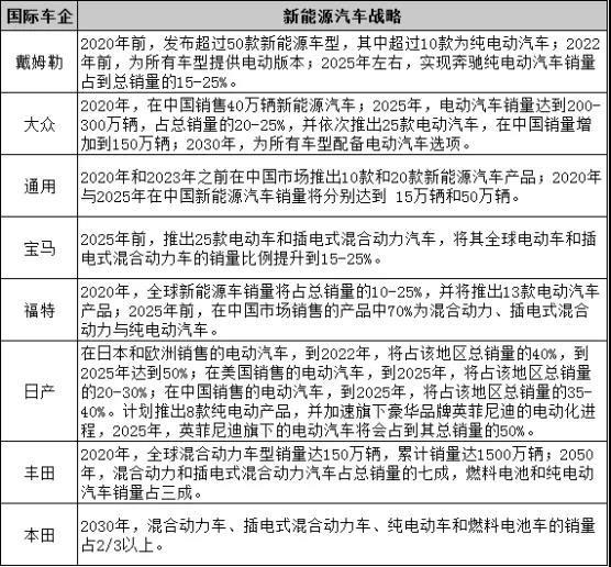 事實(shí)上,包括戴姆勒、大眾、寶馬、通用、福特、豐田等幾乎所有的國(guó)際車(chē)企均給出了明確的電動(dòng)化信號(hào),并制定了清晰的戰(zhàn)略目標(biāo)。對(duì)于動(dòng)力電池的需求自然水漲船高。
