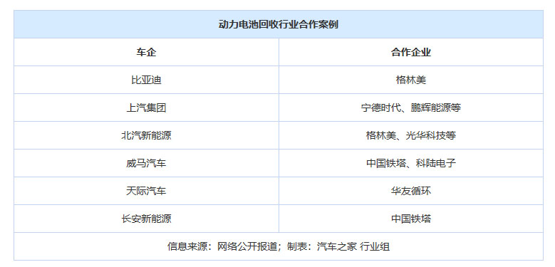 羅蘭貝格管理咨詢公司執(zhí)行總監(jiān)吳釗看來,具備客戶和渠道基礎是解決動力電池回收問題的核心,考慮到電池回收的運營體系復雜性,目前市場上主流做法為“抱團合作”,即車企、電池企業(yè)及回收企業(yè)達成戰(zhàn)略合作,利用各自的優(yōu)勢,解決動力電池回收難題。