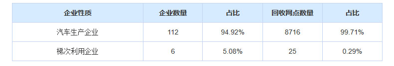 汽車之家統(tǒng)計出工信部公布的動力電池回收網(wǎng)點情況,截至2020年5月,全國共有回收服務網(wǎng)點8741個,其中涉及整車企業(yè)112家,梯次利用企業(yè)6家。從網(wǎng)點分布情況來看,車企建立的回收網(wǎng)點占據(jù)絕大部分數(shù)量,在全國各地均有覆蓋。從具體網(wǎng)點來看,以汽車企業(yè)4S店網(wǎng)絡為主,也有少部分與車企合作的報廢拆解企業(yè)建立的網(wǎng)點,以及梯次利用企業(yè)建立的網(wǎng)點。