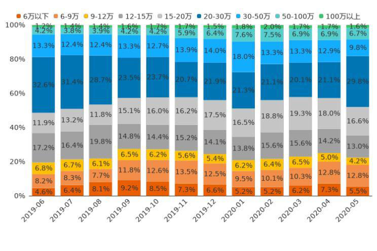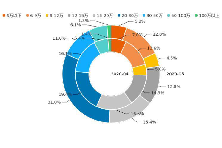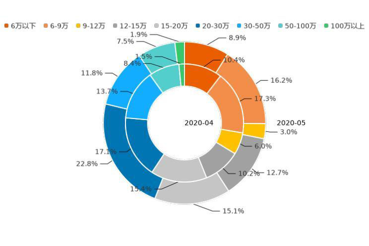 通過分析近12個月的用戶意向數(shù)據(jù)發(fā)現(xiàn),2019年6月至今年5月,12萬以下價區(qū)用戶意向占比增加2.9個百分點,低價市場熱度有所升溫;12-20萬價區(qū)用戶意向占比上漲0.5%,市場熱度保持小幅增長;20萬以上價區(qū)用戶意向占比,下跌3.4個百分點,其中,30-50萬價區(qū)市場熱度下滑明顯,近12個月線索占比下跌3.5%。未來,隨著新能源車型的布局更全面,市場將進一步細分,價區(qū)覆蓋也會更加均勻。