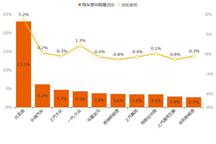 在日趨激烈的市場競爭中,各車企對于用戶的爭奪也是愈演愈烈。縱觀5月市場,TOP 10廠商用戶購車意向占比累計達58.3%,相較上月份額增加3.8個百分點,市場集中度進一步提升。十個廠商中,有4個廠商用戶意向占比實現(xiàn)上漲,份額增幅最大的廠商為比亞迪,以5.2%的增幅領漲TOP 10廠商;跌幅最大的廠商為奇瑞新能源,下降比例為0.8%。與上月相似,比亞迪、長城汽車仍為用戶最為青睞的兩個廠商,用戶意向占比分別為23.1%、6.2%,市場榜首地位穩(wěn)固。