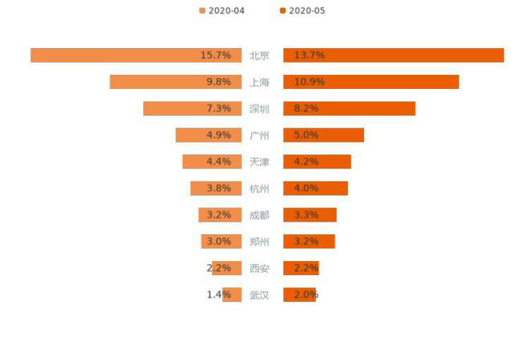 了解了用戶購車意向的省份分布,我們再來看一下城市格局。今年5月,非限購城市的用戶意向占比達51.1%,仍居市場主力。用戶購車意向占比最高的5個城市包括北京、上海、深圳、廣州、天津,北京以13.7%的意向占比榮登榜首。