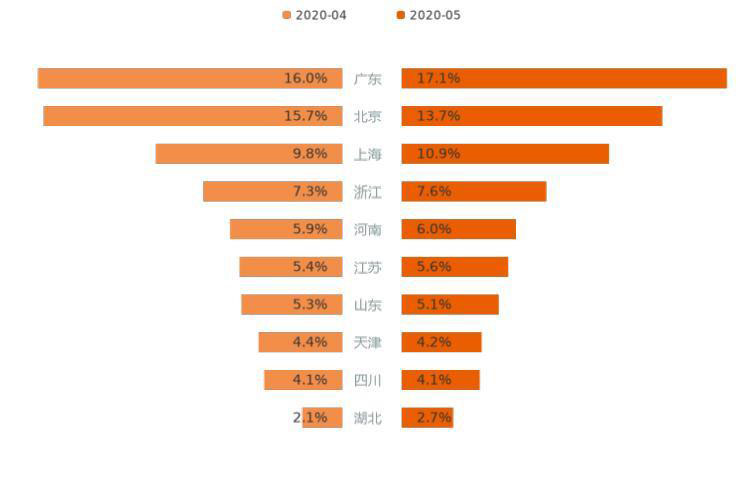 上述10個省份中,用戶意向占比有所增長的有6個,僅3個省份的意向占比出現(xiàn)不同程度下滑,一個省份持平。其中,廣東和上海用戶意向都增加1.1%,為意向占比增長較高的省份;北京減少2%,為下降最多省份。