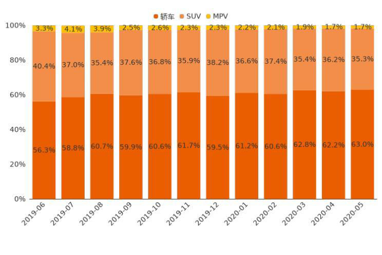 ■ 分車型級別走勢:轎車用戶占比持續(xù)上漲,SUV意向占比下滑