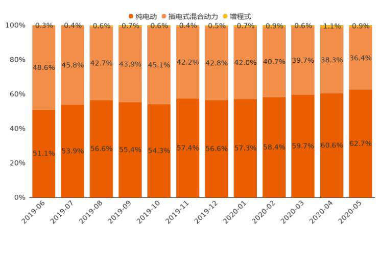 今年5月,新能源車中純電動車型用戶購車意向占比為62.7%,相較上月小幅上漲2.1個百分點,購車意向占比持續(xù)提升;插電式混合動力車型購車意向占比為36.4%,與上月相比小幅下跌1.9個百分點,購車意向占比持續(xù)下滑;增程式車型用戶意向占比僅為0.9%。整體來看,最近一年時間純電動車用戶意向一直高于50%的位置,且最近幾月呈上升態(tài)勢。這一定程度上反映了經(jīng)過一段時間引導,用戶對純電動車的認知度和接受度在提高。