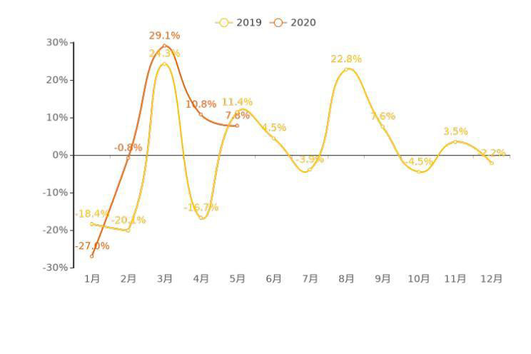 首先,我們來看一下新能源汽車的整體走勢如何。2020年5月,新能源車用戶購車意向數(shù)量環(huán)比增長7.8%,相較上月環(huán)比增長率下滑3個百分點,市場熱度持續(xù)攀升,但增幅有所收窄。汽車市場具有明顯的季節(jié)性和周期性,我們將今年的用戶購車意向數(shù)據(jù)與上一年的數(shù)據(jù)對比來看,今年5月與上一年同期相比,上漲走勢有所放緩。