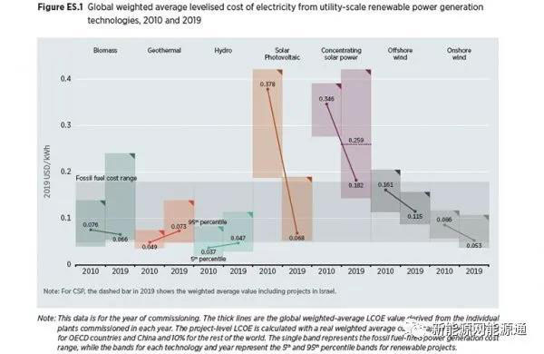 僅在2019年,公用事業(yè)規(guī)模的太陽(yáng)能光伏發(fā)電的成本就下降了13%,達(dá)到了每千瓦時(shí)(kWh)0.068美元的全球平均水平。陸上和海上風(fēng)力發(fā)電均下降了約9%,分別為0.053美元/千瓦時(shí)和0.115美元/千瓦時(shí)。