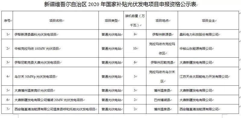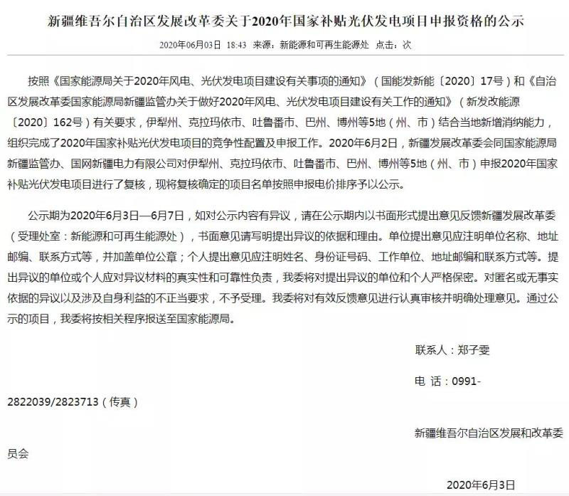 今日從新疆發(fā)改委官網(wǎng)獲悉,新疆維吾爾自治區(qū)發(fā)展改革委發(fā)布關(guān)于2020年國家補貼光伏發(fā)電項目申報資格的公示,按照國家能源局和自治區(qū)有關(guān)要求,現(xiàn)將復(fù)核確定的項目名單按照申報電價排序予以公示。