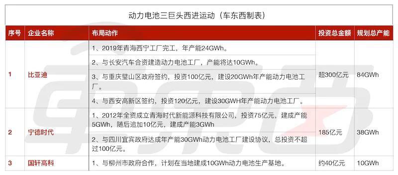 比亞迪、寧德時(shí)代、國(guó)軒高科三家國(guó)內(nèi)動(dòng)力電池出貨量前三的公司,已經(jīng)吹響了動(dòng)力電池產(chǎn)業(yè)西進(jìn)的號(hào)角,爭(zhēng)先恐后在青海、四川、重慶、柳州等西部重鎮(zhèn)落下棋子,成為了這場(chǎng)“西部攻勢(shì)”的先行者。
