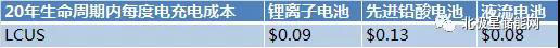 在20年的服務(wù)期內(nèi),通過LCUS公式計(jì)算儲鋰離子電池、鉛酸電池、液流電池每充一次電的成本如下: